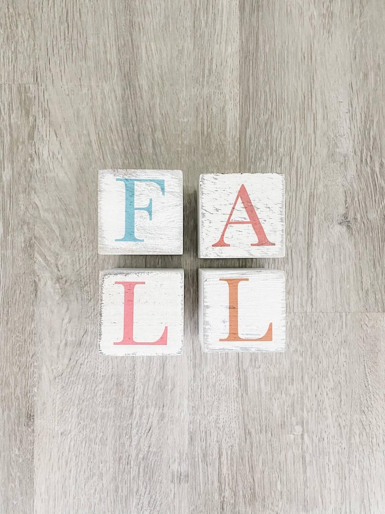 This playful set features four painted wood blocks spelling F-A-L-L in seasonal hues. Each block approx. 2" x 2". Great for tiered trays or shelves.