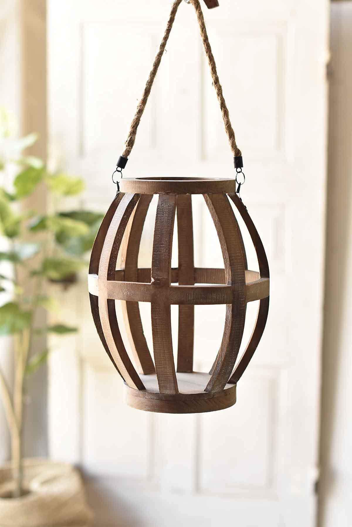 This neutral wood lantern has curved edges and a rope handle for hanging or tabletop use. Fits candles or fairy lights. Approx. 12" tall.